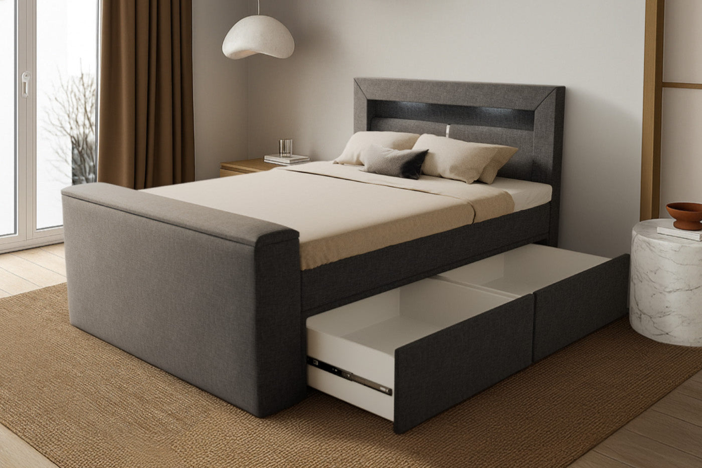 Ein Boxspringbett 140x200 mit integriertem Stauraum kombiniert Komfort und Funktionalität. Bettkasten oder Schubladen schaffen Platz für Bettwäsche, Kissen oder Kleidung – ohne zusätzlichen Raum zu benötigen. Besonders in kleineren Schlafzimmern ist das praktisch, da du Stauraum gewinnst, ohne auf Eleganz und Schlafkomfort verzichten zu müssen.