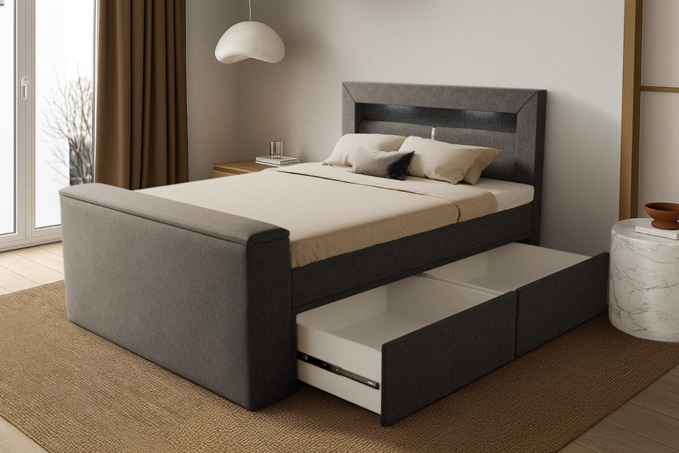 Grau, Beige oder Anthrazit sind besonders beliebt, da sie sich vielseitig kombinieren lassen und in jedes Schlafzimmer passen. Wer es edel mag, setzt auf Samtbezüge in kräftigen Tönen wie Blau, Grün oder Bordeaux. Auch Kunstleder in Weiß oder Schwarz wird geschätzt – modern im Look und gleichzeitig pflegeleicht.